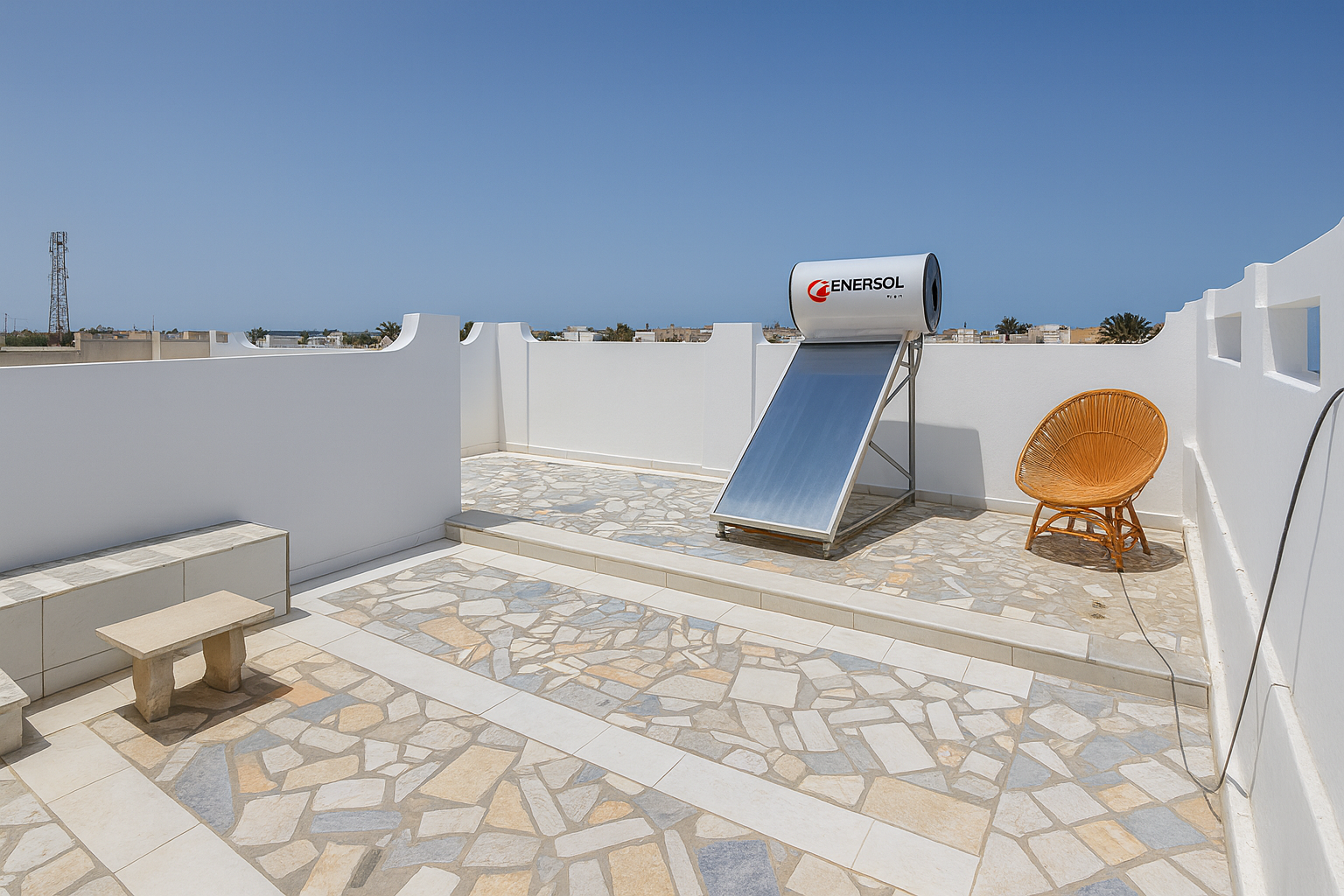 Maison polyvalente à Midoun, Djerba, combinant un rez-de-chaussée familial et deux appartements indépendants, avec jardins, terrasse sur le toit et équipements solaires. Une opportunité idéale pour concilier habitation et projet locatif à quelques minutes de la mer et de la zone touristique.