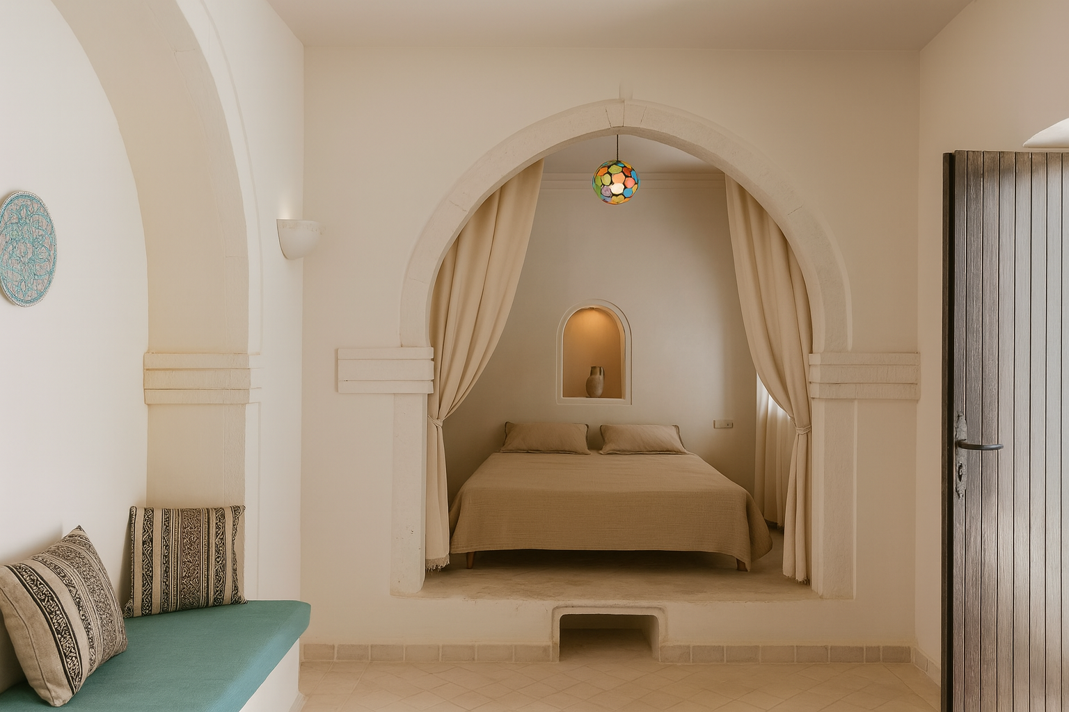 Cette villa traditionnelle de style houch, située en zone urbaine près du centre de la ville de Midoun, offre environ 120 m² couverts sur une parcelle de 223 m². Recente mais pleine de charme, elle combina arcades, fer forgé et confort moderne pour une installation réussie ou un investissement locatif. De plain-pied, elle propose deux magnifiques suites indépendantes et un séjour typique tourné vers l’extérieur. La piscine s’ouvre sur une belle terrasse fleurie avec abri en paille, dans un environnement calme et serein, à seulement une dizaine de minutes en voiture de la mer. La climatisation dans toutes les pièces et le stationnement devant la maison complètent cet oasis méditerranéen.