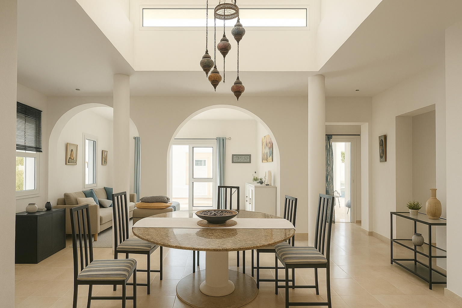 À Djerba, cette maison typique conjugue confort moderne et exotisme: ~200 m² couverts sur une parcelle arborée d’environ 618 m². Le rez-de-chaussée réunit un salon-salle à manger avec cuisine ouverte, 1 chambre et 1 salle d’eau; à l’étage, 2 chambres et 2 salles d’eau. On aime la sublime terrasse aménagée avec vues sur la mer, les palmiers et oliviers, ainsi que la piscine bleue idéale pour les journées ensoleillées. Climatisation dans chaque pièce, grand garage et environnement serein à quelques minutes du rivage. Titre Bleu et situation en Zone Urbaine pour une acquisition sereine et conforme.