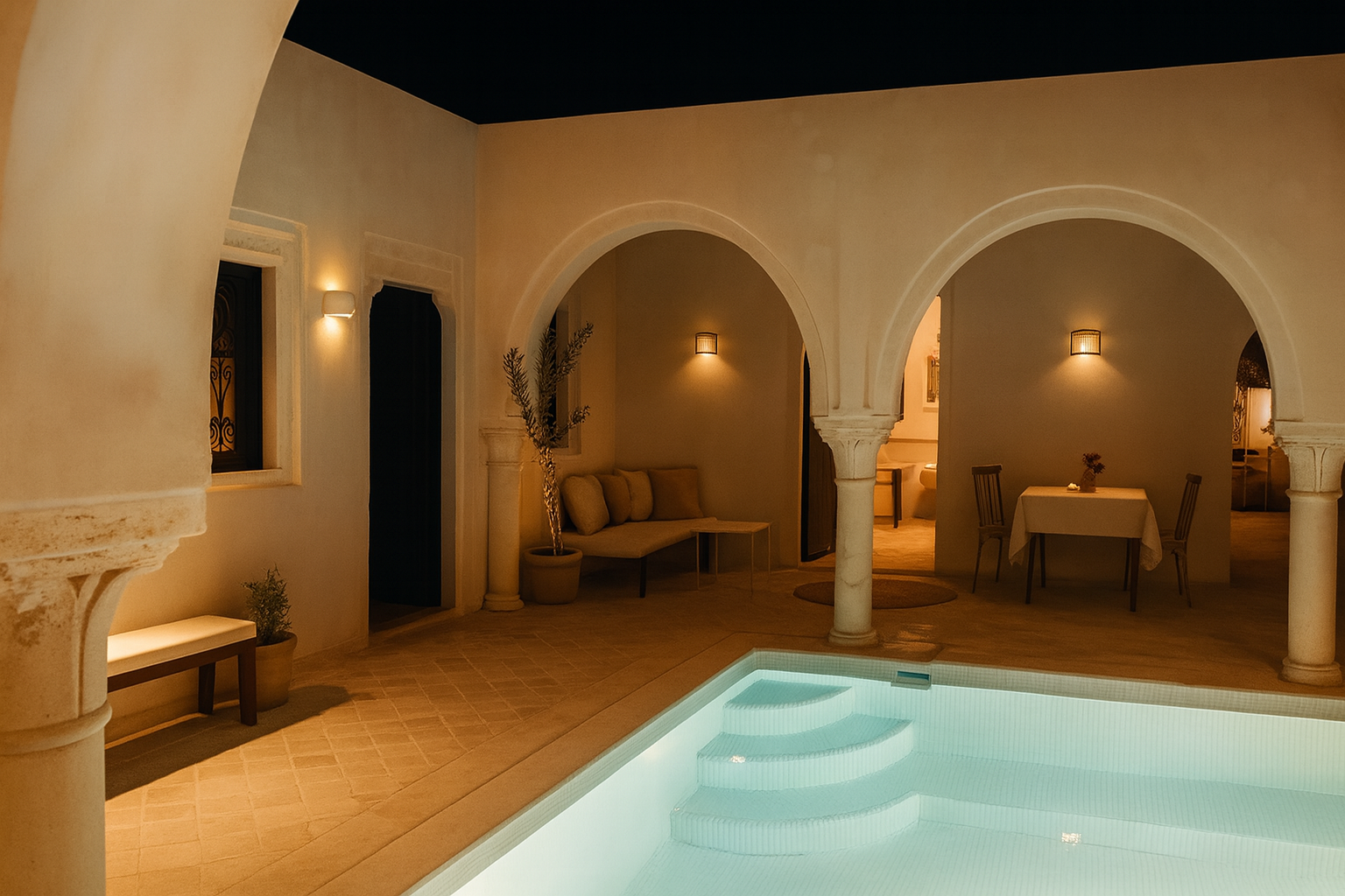 Cette villa traditionnelle de style houch, située en zone urbaine près du centre de la ville de Midoun, offre environ 120 m² couverts sur une parcelle de 223 m². Recente mais pleine de charme, elle combina arcades, fer forgé et confort moderne pour une installation réussie ou un investissement locatif. De plain-pied, elle propose deux magnifiques suites indépendantes et un séjour typique tourné vers l’extérieur. La piscine s’ouvre sur une belle terrasse fleurie avec abri en paille, dans un environnement calme et serein, à seulement une dizaine de minutes en voiture de la mer. La climatisation dans toutes les pièces et le stationnement devant la maison complètent cet oasis méditerranéen.